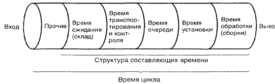 не существовать потому, что они определяются временем производственных циклов изготовления, как это показано на рис. 2. Уменьшая цикл изготовления, мы уменьшаем одновременно и заделы. Часто это нетрудно сделать. Как показывает рис.2, большая часть времени продукта — это непроизводительная часть, которую можно рассматривать как время потерь, или «сотворенное время».